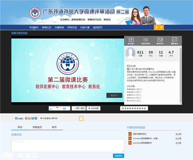 廣外深知微課大賽會涉及多項繁雜的步驟工作,并找到知名錄播廠家奧威亞。針對廣外的實際情況,奧威亞在應用平臺上專門設計打造了微課比賽活動的欄目,將傳統的評課步驟一一簡化。現在,評課專家可以在線上完成所有的評課步驟,再也不用看到厚厚的紙質評價表了~