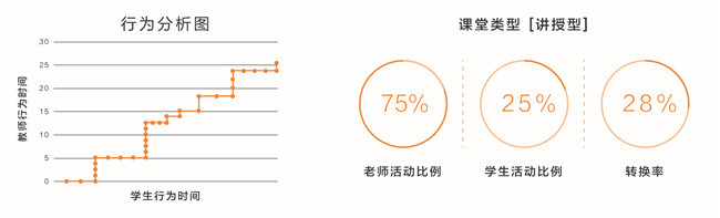 除了能節省評課的時間以外,奧威亞更是為評課專家提供實實在在的評課協助。在課程錄制的過程中,系統將自動分析視頻數據,并對應生成ST行為分析圖和教學行為活動餅圖,為評課專家提供更直觀的客觀數據。