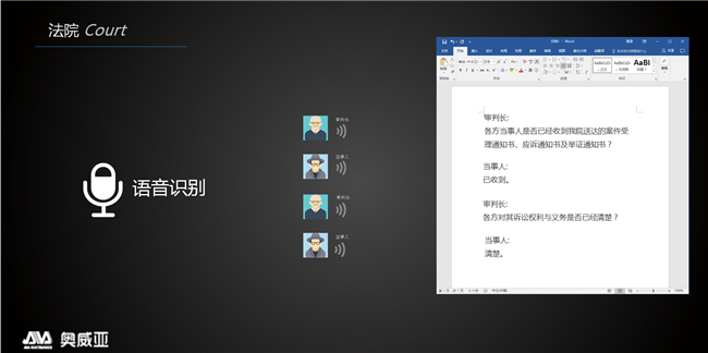 奧威亞智能語音庭審記錄運用科技的力量,可以智能記錄庭審的語音全過程,庭審筆錄自動生成,減輕書記員的工作壓力。讓庭審人員能夠更專注于庭審內容,提高法院庭審質效。