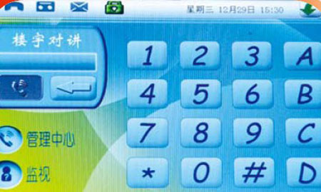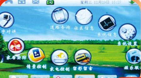 將該機連接電源后打開,大約5秒鐘后進入系統頁面。該頁面借鑒了消費類電子便捷簡單的操作方式,運用圖形和文字進行雙重指示,形象生動。觸摸屏的反應速度也快,只需輕輕點擊即可完成相應的功能操作,方便快捷,貼近現代人的e生活。該機的所有功能也在主頁上一目了然:具備了傳統分機樓宇對講、留影留言、社區信息功能;添加了道路導航、家庭娛樂、數碼相框實用功能;也可實現家電控制、情景控制的智能家居操控,可謂是一臺功能全面而強大的智能終端。