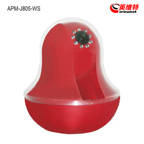 APM-J805-WS是英維特的一款私模產品,設計新穎,造型可愛獨特,非常適合家里溫馨的氛圍。顏色分為黑色和紅色,您可以根據需要選購。它配置1/4"彩色CMOS傳感器和f: 3.6 mm,F:2.0 (紅外鏡頭)(可選 6mm 鏡頭)鏡頭,最高分辨率為640 x 480像素,最低照度0.5Lux。APM-J805-WS安裝有8個紅外燈,夜視距離可達10米。雙云臺設計可以實現水平350度和垂直120度轉動,支持15個預置點監控。
