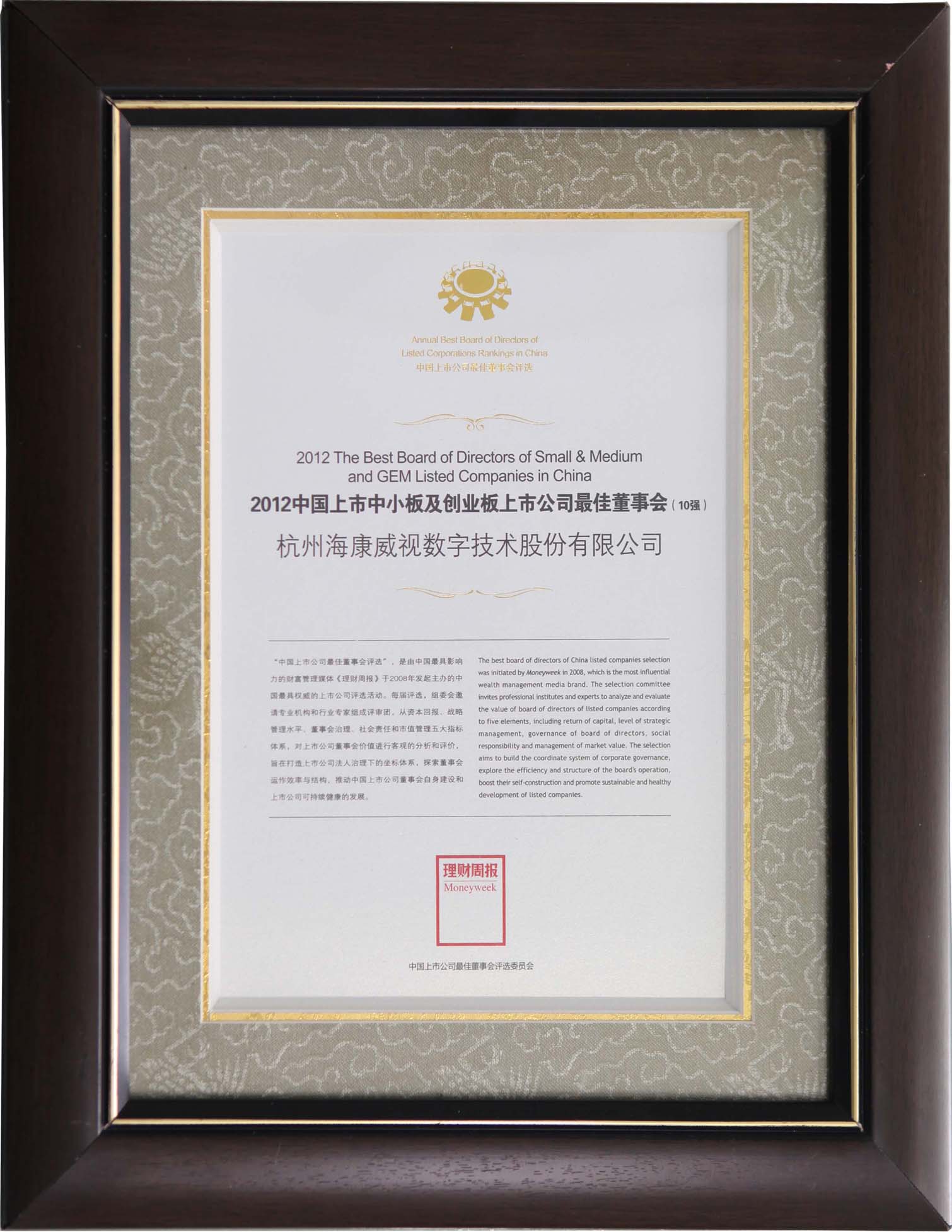 2011年,海康威視曾獲評“2011 中國上市公司最佳董事會”,此次再獲榮譽,充分證明了海康威視董事會在誠信、戰略、價值管理、產業構建、執行力等方面所具有的卓越管理和成效,體現了公司在這些方面已獲得資本市場和投資者的高度認可。