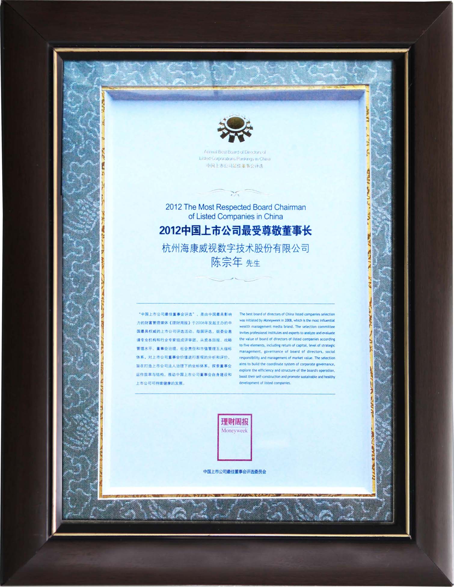 近日,由《理財周報》舉辦的2012中國上市公司最佳董事會評選揭曉,海康威視獲評“2012中國上市中小板及創業板上市公司最佳董事會(10強)”,中國電科52所所長、海康威視董事長陳宗年獲評“2012中國上市公司最受尊敬董事長”。