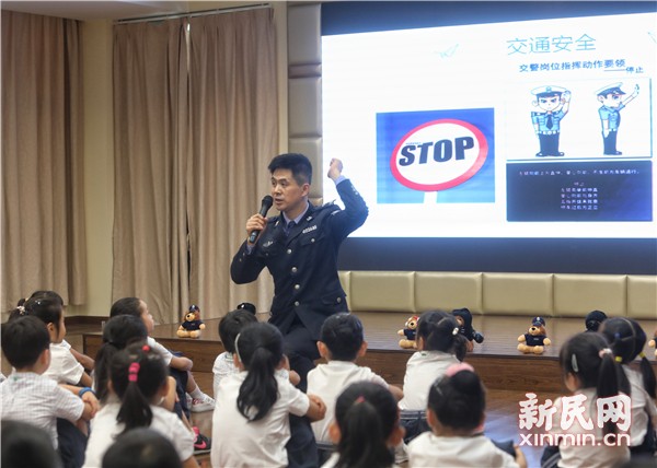 今天上午10時,節目中的人氣授課警官——市公安局治安總隊的黃奕來到了求知小學,為來自該校的120位兩年級的同學和30多位家長代表帶來一堂現場版的校園安全教育課。(新民晚報記者 張龍)