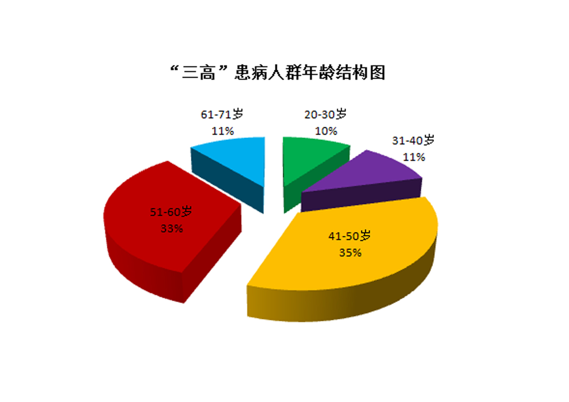 2、20-30歲有18人,占患有“三高”總數(shù)的9.9%;31-40歲有20人,占11%;41-50歲有63人,占34.6%;51-60歲有61人,占33.5%;61-71歲有20人,占11%。(詳情見“三高”患病人群年齡結(jié)構(gòu)圖)