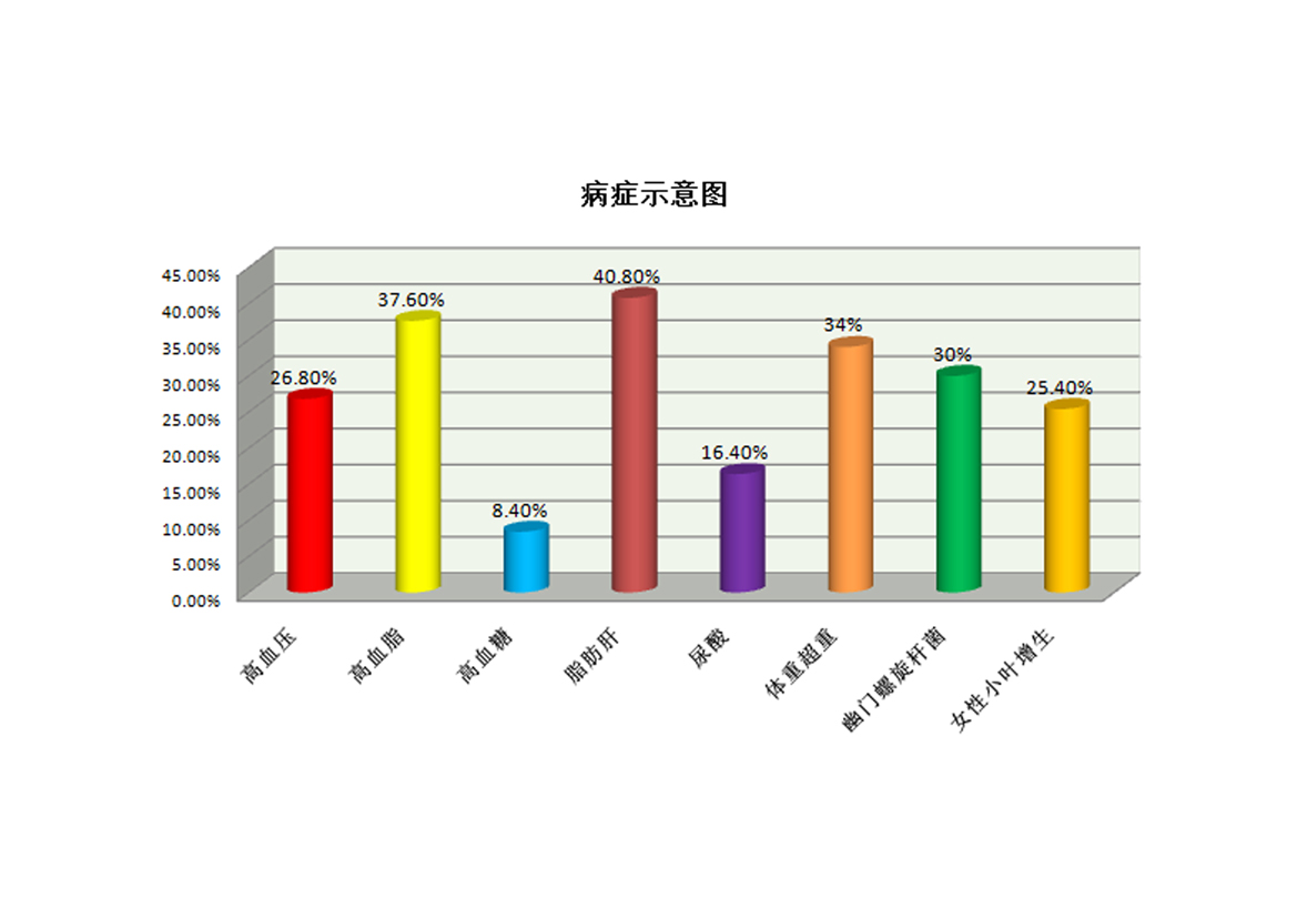 與去年體檢結(jié)果相比,行業(yè)內(nèi) “三高”(高血壓、高血脂、高血糖,下同)患病人數(shù)明顯增多,女性乳腺小葉增生、體重超重者眾多,以及幽門螺旋桿菌患病情況也較嚴(yán)重,行業(yè)從業(yè)人員健康狀況不容樂觀。(詳情見病癥示意圖)