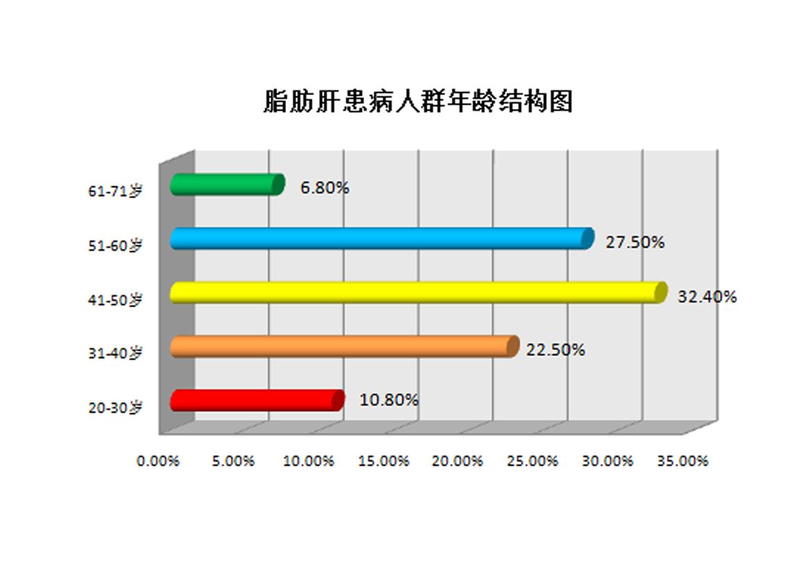 男性患病率為女性的4.67倍,40-60歲為脂肪肝高發(fā)期。(詳情見脂肪肝患病人群年齡結(jié)構(gòu)圖)