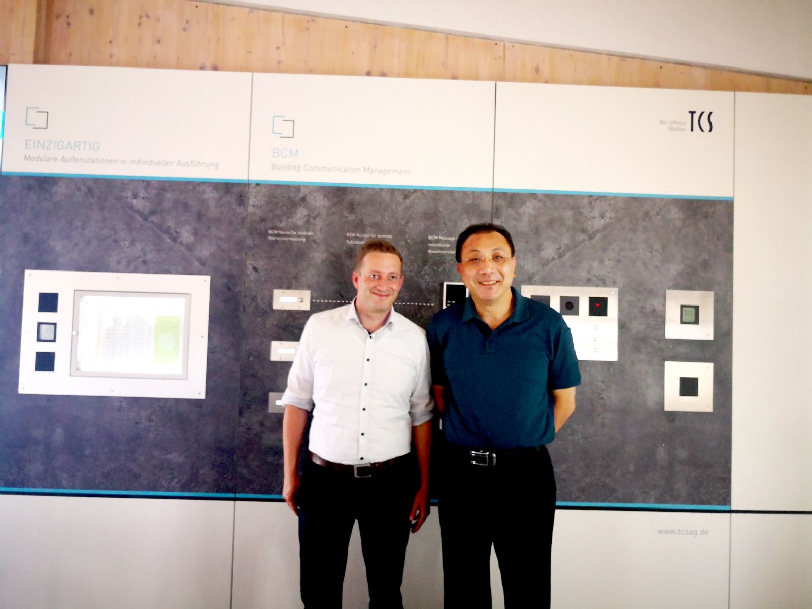 特思公司的創始人杜夫納董事長,他同時也是德國著名樓宇通訊專家,他向趙理事長介紹了特思的研發團隊。產品基于領先的無極雙路總線技術,采用數字化處理方式,使系統具有較好的穩定性和可擴展性。一條總線可以掛接 64 個獨立的門口機和多個室內話機以及各種控制和信號模塊,信息在總線上傳輸有極高的穩定性,防止截聽,保證通話和系統信息的安全。采用此總線技術,有效地突破了傳統產品的距離限制,對傳輸導線沒有特殊要求,特別是視頻信號,只需使用普通雙膠線傳輸,抗干擾性能卓越、圖像聲音清晰、施工簡單,系統調試安裝只需一人就可以完成,極大地降低了工程成本。特思員工向隨行人員展示的門衛機新產品中采用了模塊化設計,可以根據系統的需要靈活配置和使用,方便設計和系統的集成,趙理事長表示這類技術非常值得我們上海的安防企業借鑒。除了通過電話接口模塊以外,還可以通過移動電話接口、IP 接口模塊,實現用戶在全球范圍自由獲取信息。由于智能手機和平板電腦的發展,特思公司特意開發出一套新的安防和智能家居的解決方案。通過最新的軟件 技術,運用已有的個人電腦、智能手機(目前有支持 iOS系統的蘋果手機、支持安卓系統的智能手機和個人電腦的Windows系統和的基于安卓系統)的 操作,不但可實現室內話機的功能,還可以實現家庭家居的智能操作,也是特思公司的一大技術亮點。