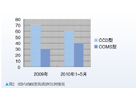 調(diào)查顯示,2010年1-5月出貨的高清網(wǎng)絡(luò)攝像機(jī)中,CCD型的產(chǎn)品份額雖仍占主導(dǎo),但優(yōu)勢(shì)正在減弱;采用CMOS感光芯片的高清產(chǎn)品的份額已經(jīng)上升到約40%。根據(jù)兩種芯片的特點(diǎn)不同,CCD主要對(duì)應(yīng)的是100萬(wàn)像素左右的攝像機(jī),CMOS主要對(duì)應(yīng)的是200萬(wàn)像素左右的機(jī)型(如圖2所示)。