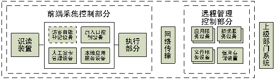遠程管理控制部分應具有對前端采集控制部分所采集的數據進行分析、認證、分發、匯總、控制、管理等功能,應能直接與上級部門系統交互。在線狀態下,前端采集控制部分應能與網絡傳輸部分、遠程管理/控制部分等構成一個完整的系統,實現遠程管理控制(如圖2所示)。